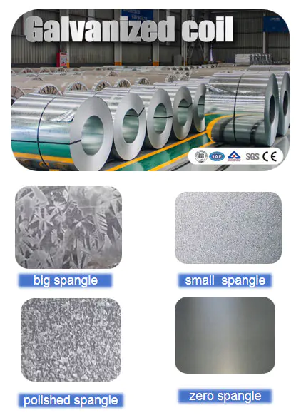 Tre slags belægning: galvaniseret (Z), galvalum (ZA), galvaniseret aluminiumsmagnesium (ZAM); Galvaniseret stålspole har tre slags spangle: regelmæssig spangle, mini spangle og spanglefri på grund af forskellige overfladeprocesser.